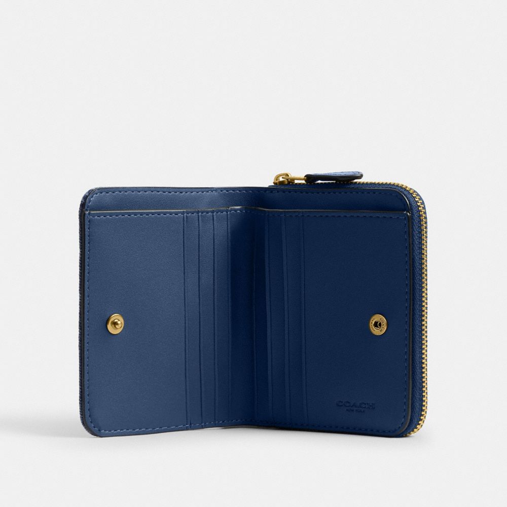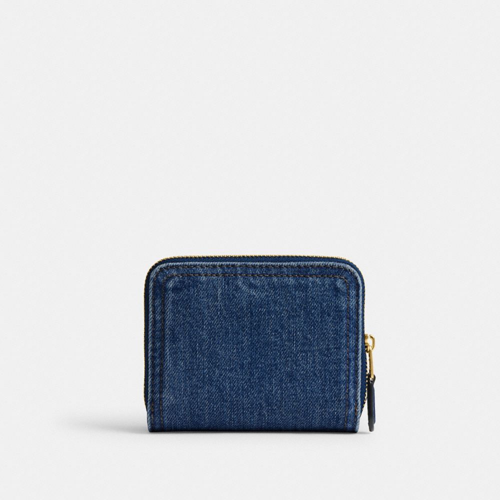 リファインド レザーとデニムの二つ折りミニ財布。コントラストスティッチとコーチの“C”のハードウェアが目を引きます。