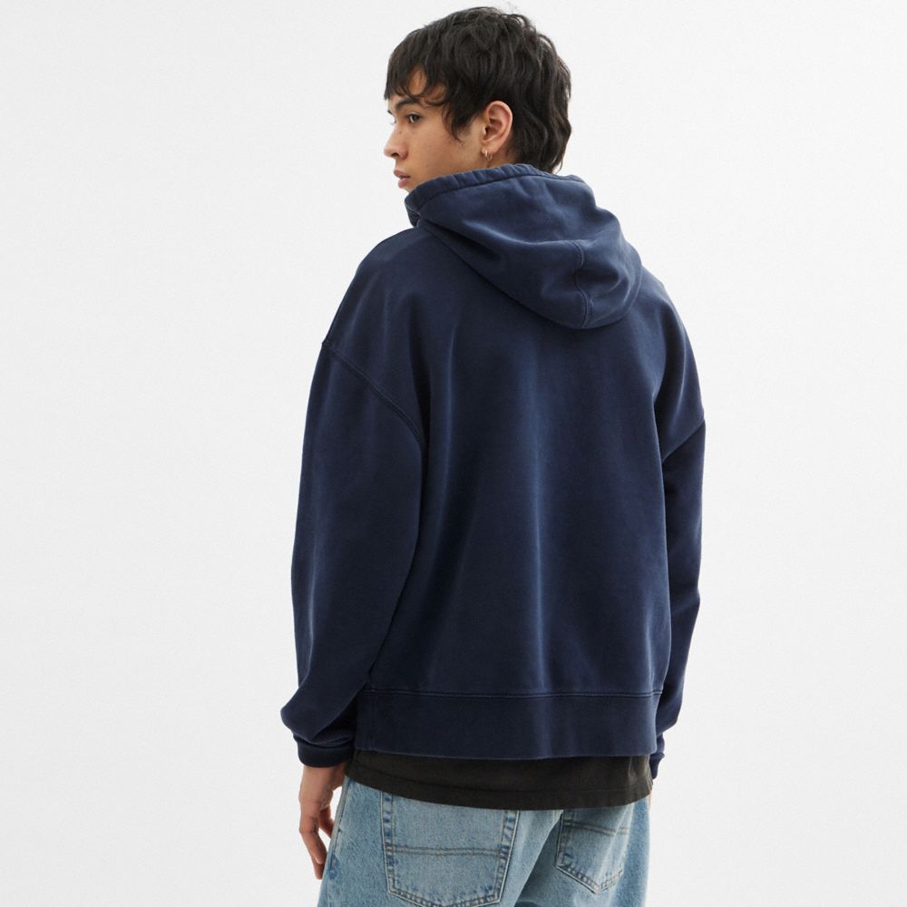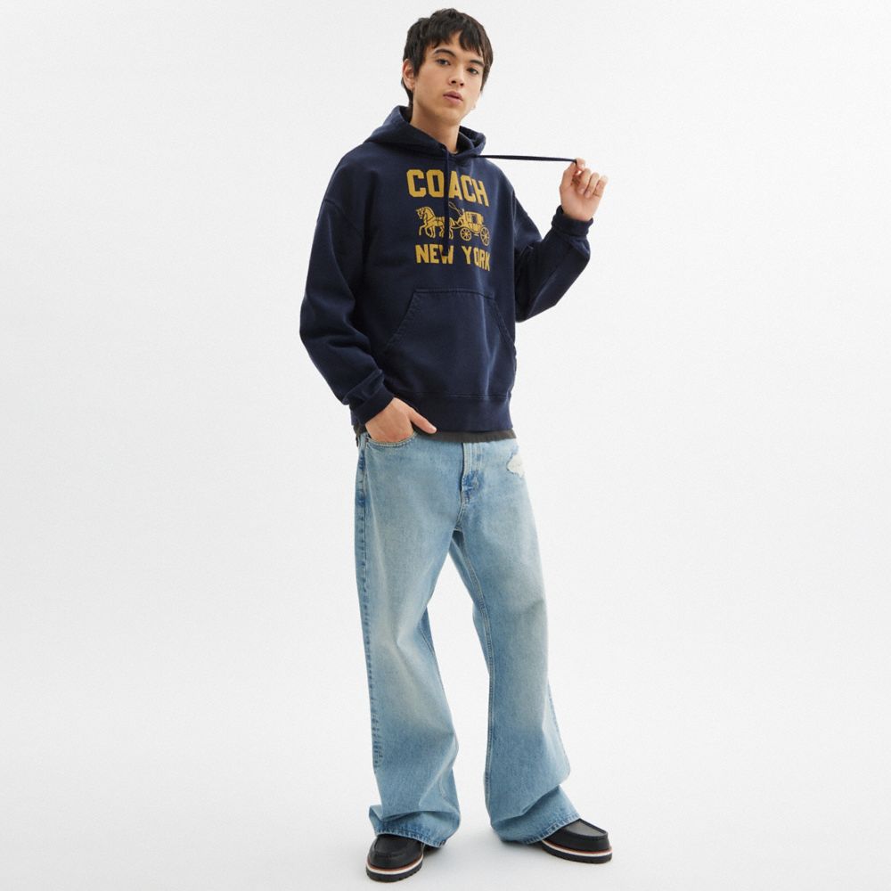 コットン素材を使用した、リラックスフィットのスウェットフーディー。コーチのグラフィックとアイコニックなホース アンド キャリッジのモチーフをプリントで施しました。ガーメントウォッシュ加工を施した柔らかいリブドインの風合いのフーディーに、カンガルーポケットをあしらいリブ編みのトリムで仕上げました。