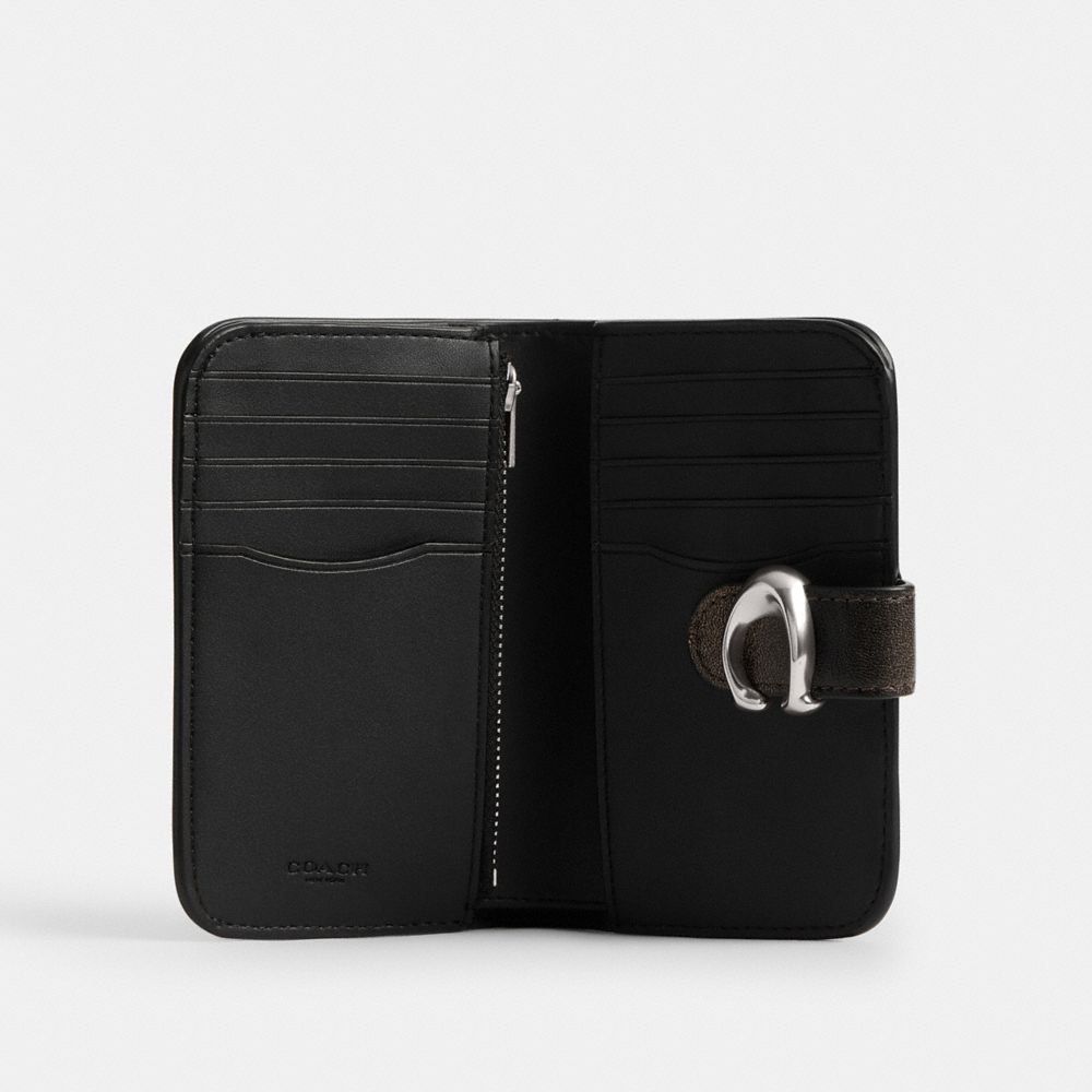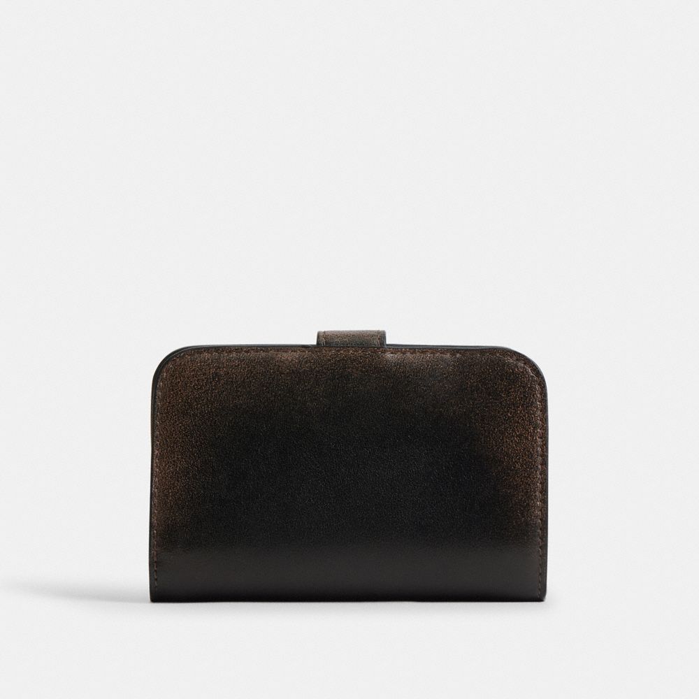 コーチの“C”のハードウェアが目を引く、二つ折りミニ財布。1970年代よりアーカイブされているコーチ デザインをモダンにアレンジし、ラブオフ加工を施して下地の色を浮かび上がらせた、使い込んだ風合いの柔らかいグレイン レザーで仕上げました。
