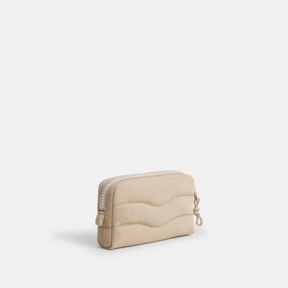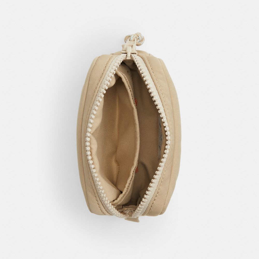 日本からのリクエストで実現した日本限定の軽量ポーチは、ふわふわが人気の定番シリーズのコンパクト版。カード、リップグロス、イヤフォンなど小さな必需品を収納するのにぴったりです。コード部分をのぞき100%リサイクルPETプラスチック(R-PET)製で、波打つような刺繍がアクセントに。ラウンドジップタイプで中身を出し入れしやすく、コーチトピアの楽しげなパッチが特徴的です。