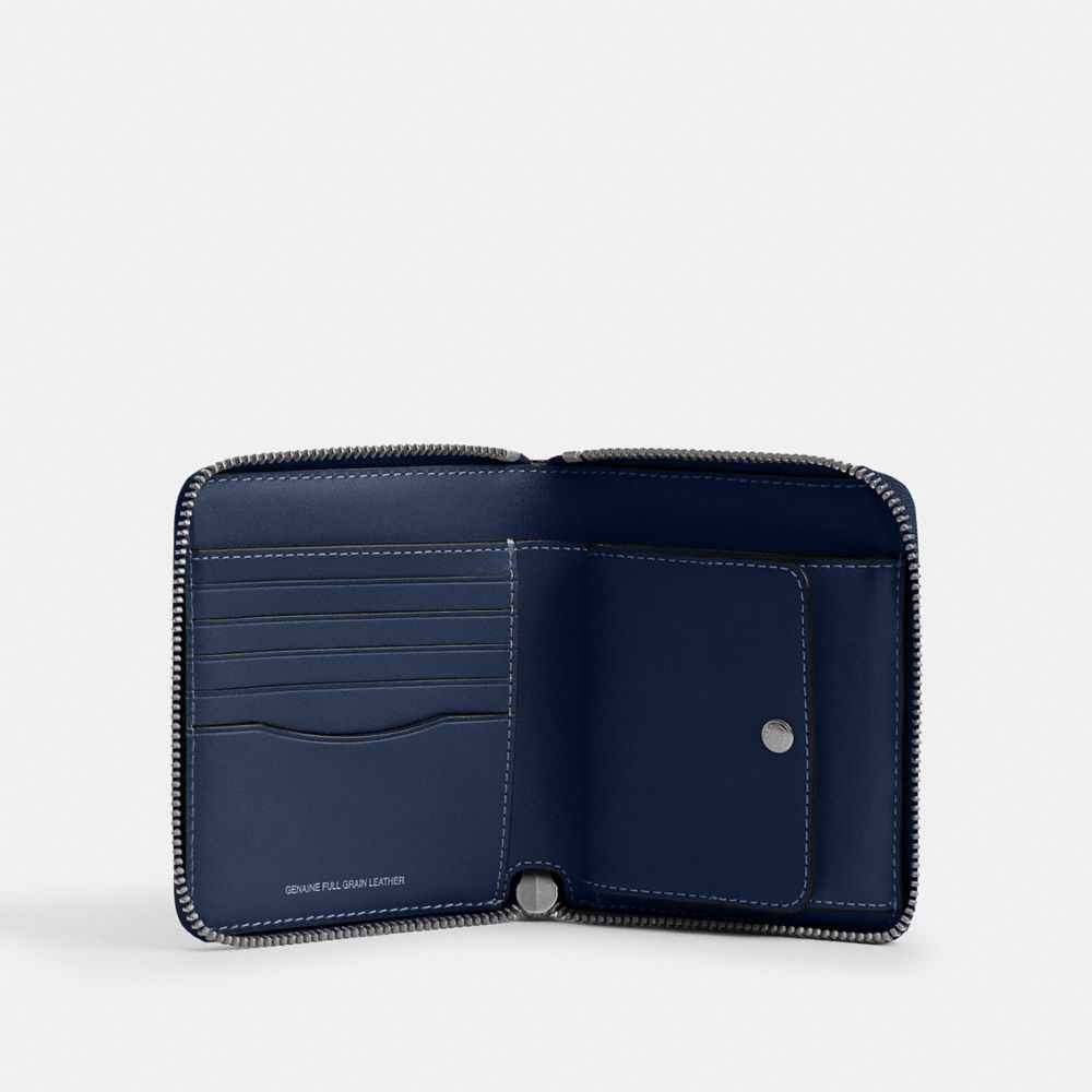 コンパクトなのに小銭を出し入れしやすい、手のひらサイズの薄い二つ折り財布。ナチュラル グレイン レザーで仕立てた、3辺に開くジップアラウンド開閉デザイン。