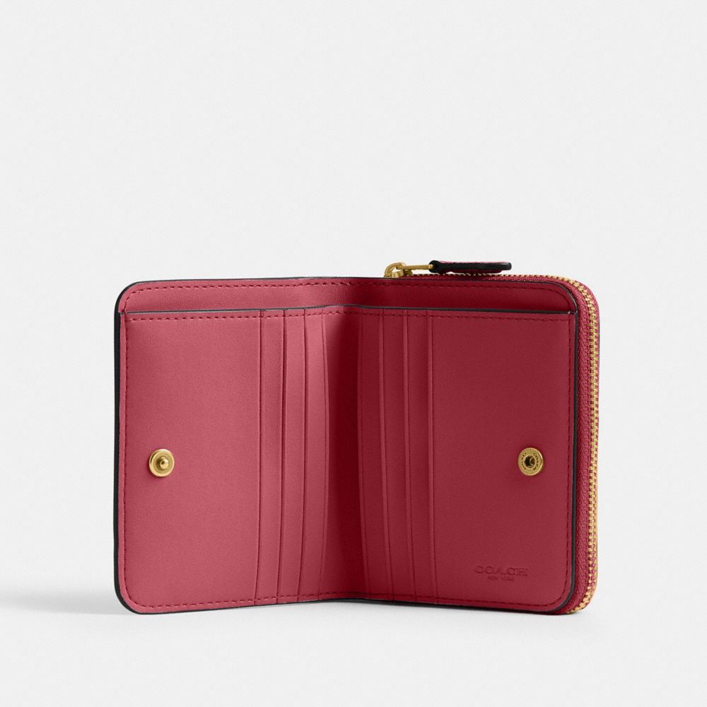 ポリッシュド ペブル レザーの二つ折りミニ財布。シグネチャー ハードウェアが目を引きます。3辺に大きく開く小銭ポケットは、レシートやイヤフォンの収納にも便利な仕切り付き。スナップを外すと、8層のカードポケットと札入れが広がります。
