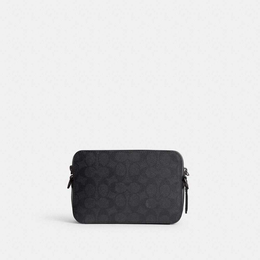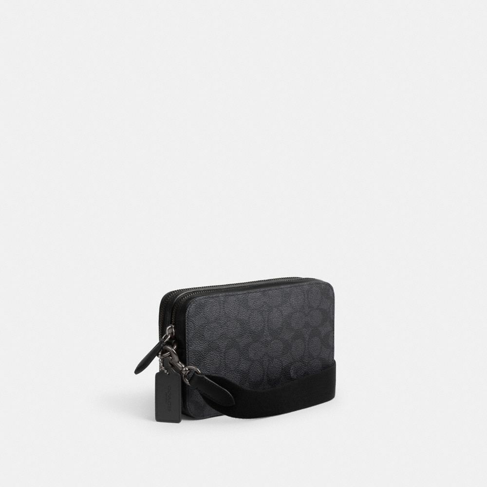 シグネチャー コーテッド キャンバスとリファインド カーフ レザーで仕上げたクロスボディ19は、必需品がすっきり入るサイズ感のダブルジップ開閉式。カードスロットや多機能ポケットを備え、スマートフォンや財布などを収納できます。長さ調整可能の軽量ウェビングストラップを付ければ、ショルダー&斜め掛けの2WAYでお使いいただけます。