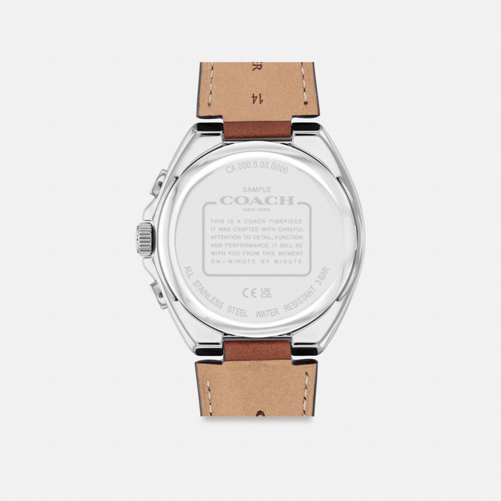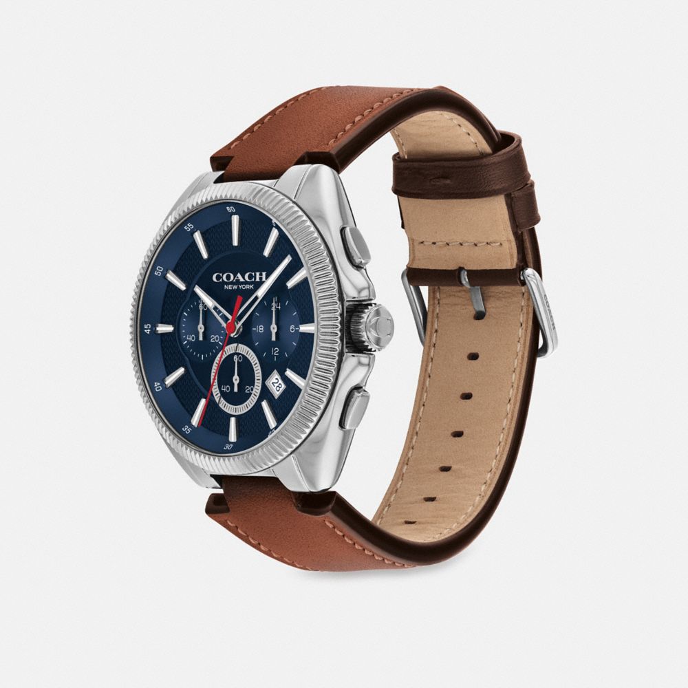 こだわりのスタイルと堅牢な機能性を兼ね備えたジャクソン。移動が多い方に最適なデザインです。文字盤に日付ウィンドウと3つのサブダイヤル(秒、分、時間)をあしらい、レザーストラップを合わせた、ステンレススチールのクロノグラフです。