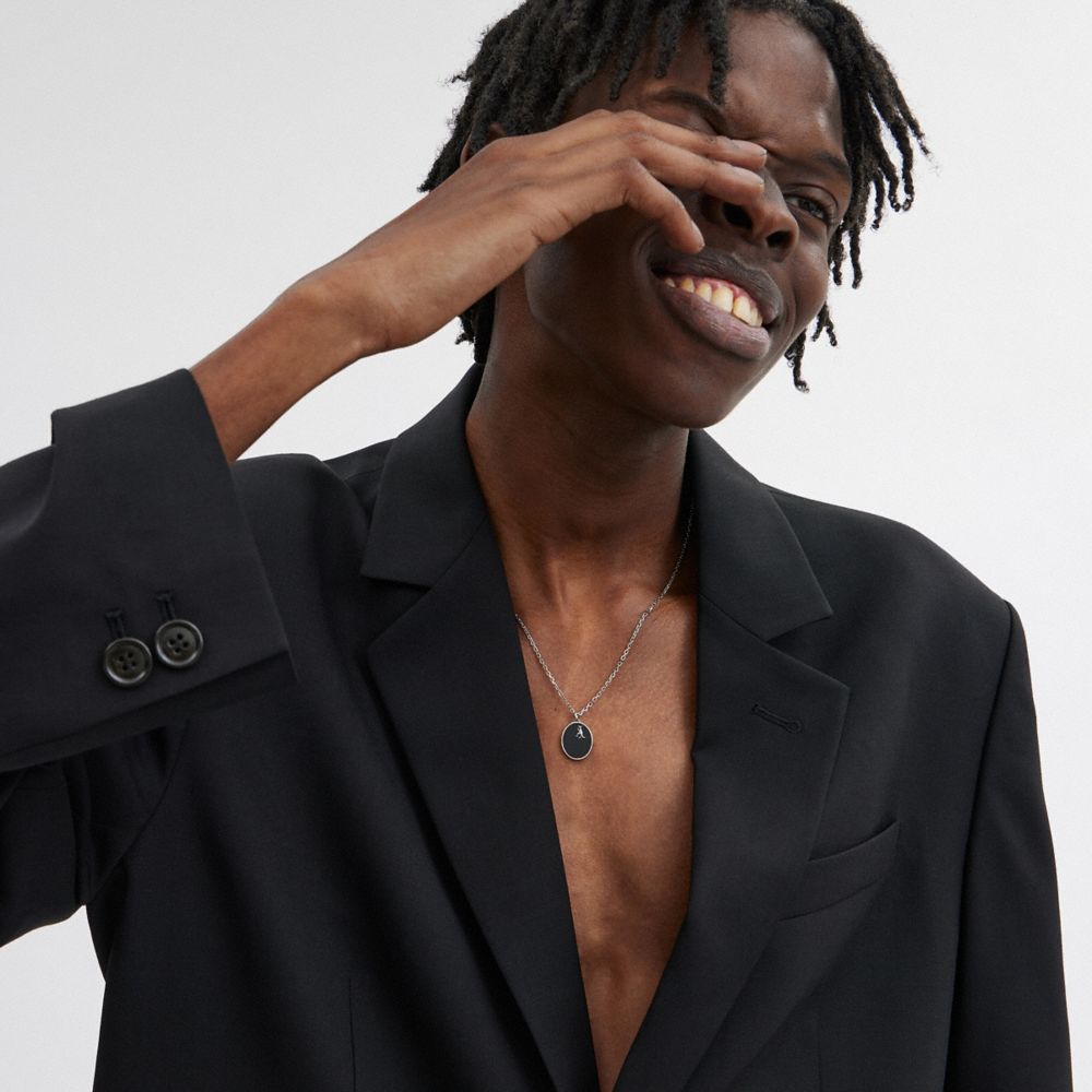 スターリングシルバーのロング チェーン ネックレス。メンズ ジュエリー コレクションの一つです。エナメルのコイン ペンダントに、コーチのアイコン キャラクターの恐竜<レキシー>を添えました。つけ外しが簡単なクラスプ開閉式です。