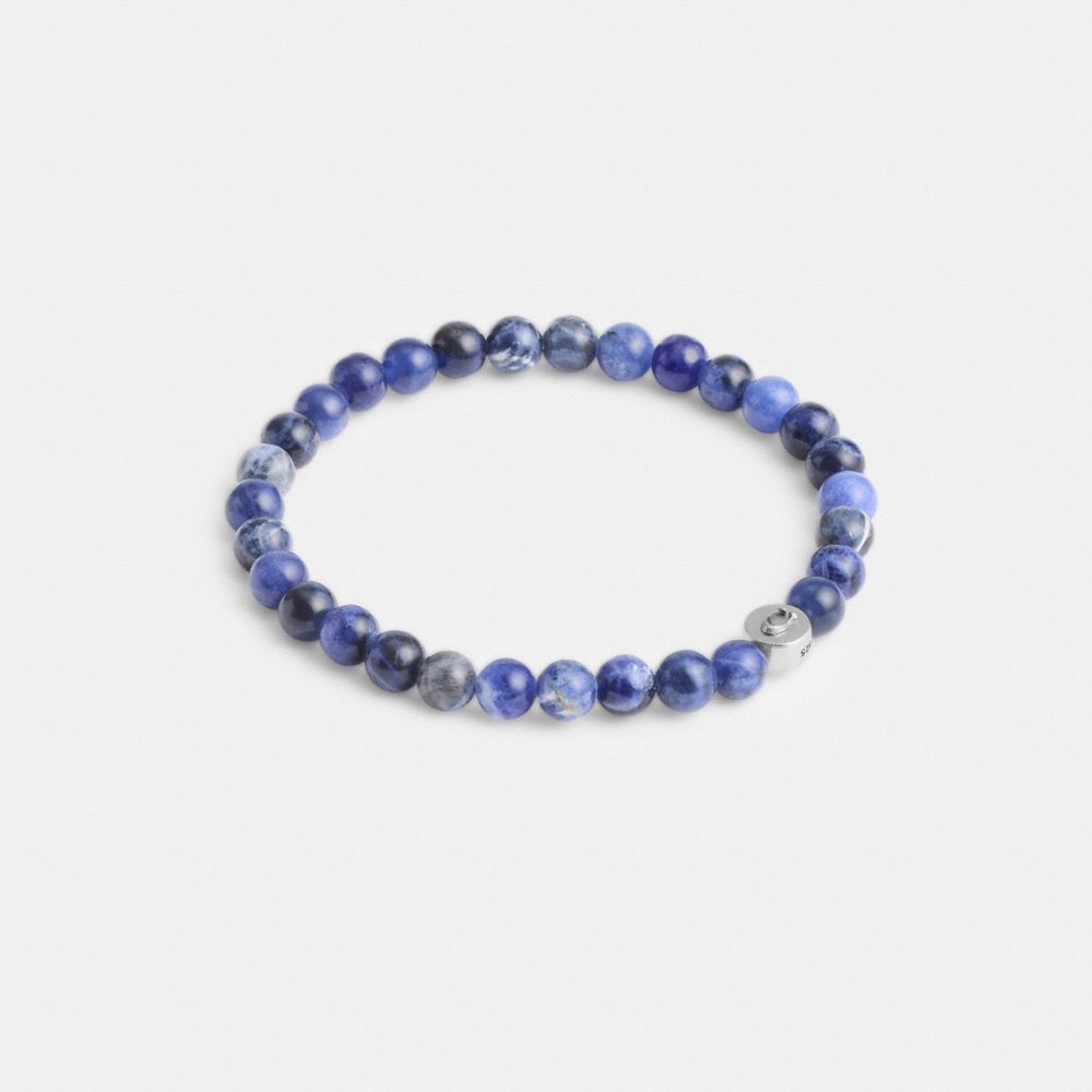 ブルー ソーダ ライトのビーズ ブレスレット。メンズ ジュエリー コレクションの一つです。スターリングシルバー ディスクの片面にはコーチの“C”を、もう片面にはコーチのアイコン キャラクターの恐竜<レキシー>をあしらいました。伸びるテグスが手首に心地よくフィットします。ご自分用はもちろん、お祝いやギフトにもおすすめです。