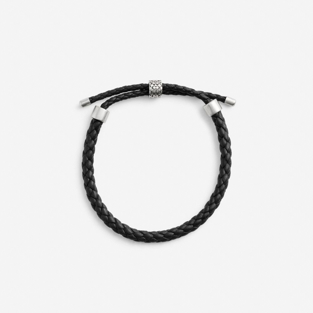 コーチの伝統のレザーのクラフトマンシップが光るブレスレット。メンズ ジュエリー コレクションのアイテムです。レザーの編み紐のスタイルに、スターリングシルバーのディテールを添えて仕上げました。スライド開閉式で、手首に心地よくフィット。ご自分用はもちろん、お祝いやギフトにもおすすめです。