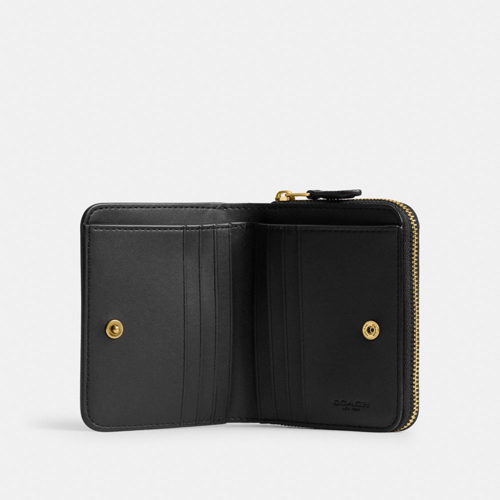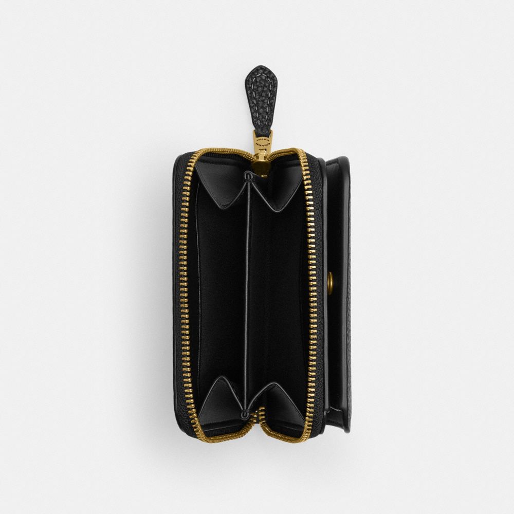 ポリッシュド ペブル レザーの二つ折りミニ財布。正面にあしらったコーチのアイコン キャラクターの恐竜<レキシー>が目を引きます。