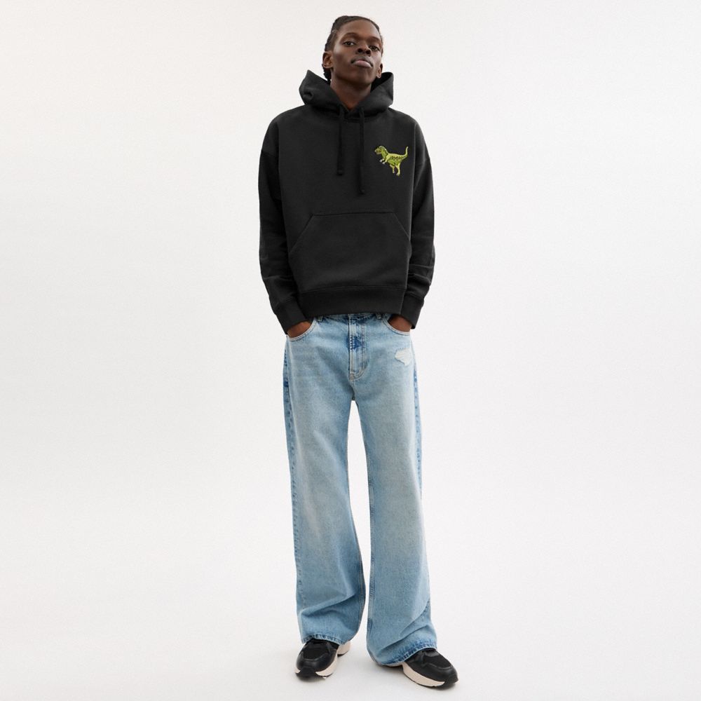 柔らかいコットン素材のリラックスフィットのフーディー。コーチのアイコン キャラクターの恐竜<レキシー>の刺繍パッチが遊び心を添えます。スポーティなシルエットにカンガルーポケットをあしらい、バンドのトリミングで仕上げました。