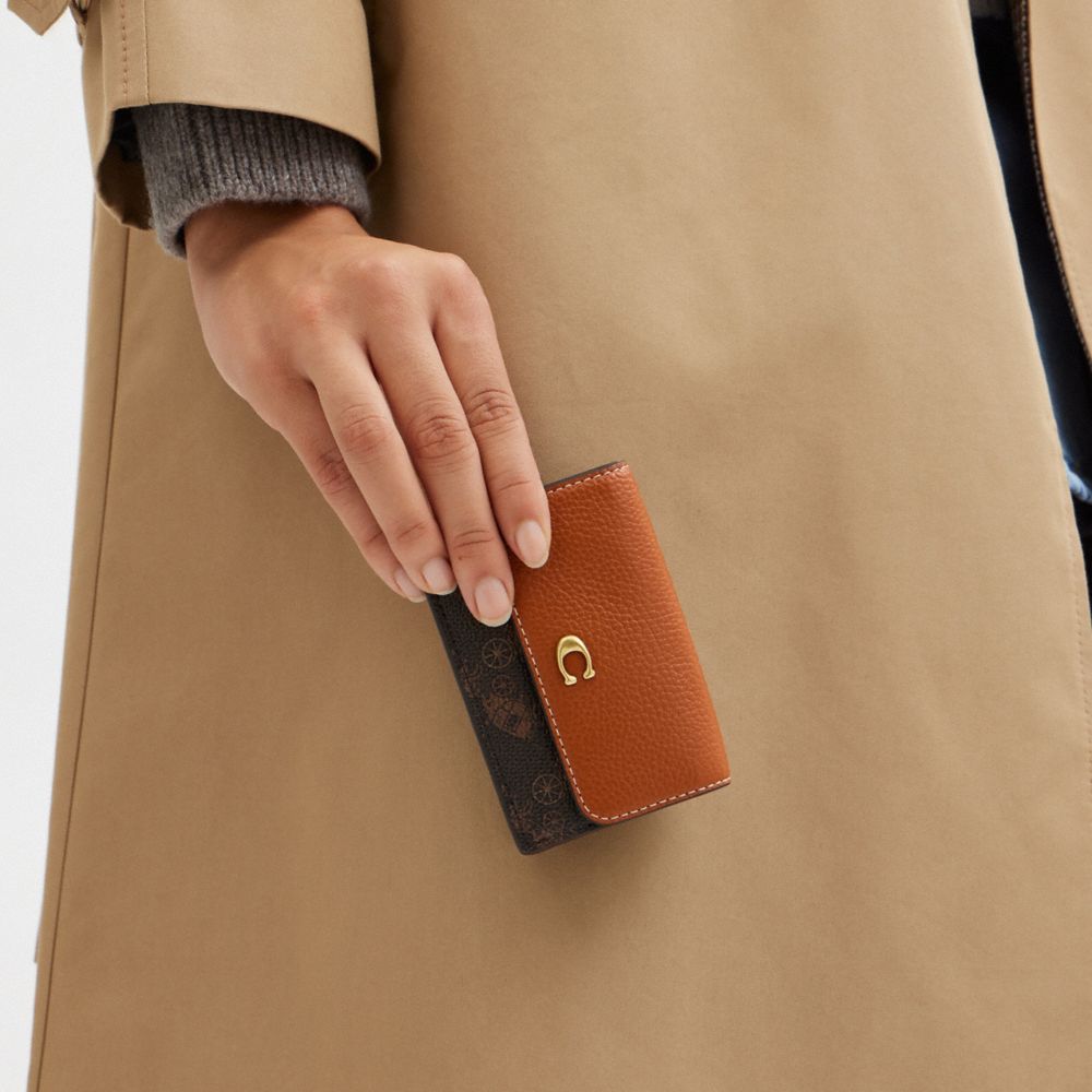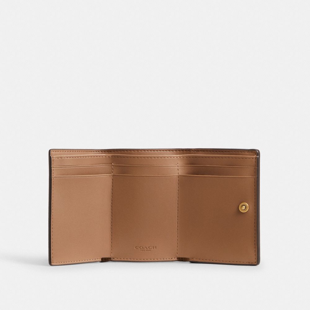 コンパクトなデザインながら整理整頓がしやすい三つ折り財布。ポリッシュド ペブル レザーとプリンテッド コーテッド キャンバスに、コーチの“C”のハードウェアがアクセント。