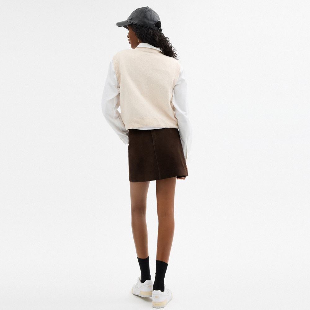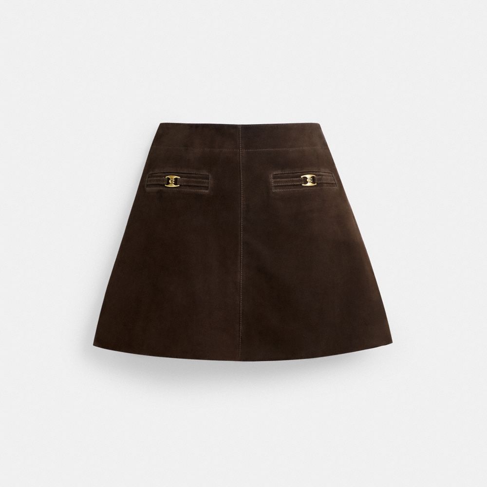 ウェルトポケットにコーチの“C”のプラークをあしらった、贅沢なほど柔らかいスエードのミニスカート。シルエットを損なわない隠しジップ開閉式です。単体での着用はもちろん、お揃いのブレザーを合わせたコーディネート ルックを楽しんでみても。