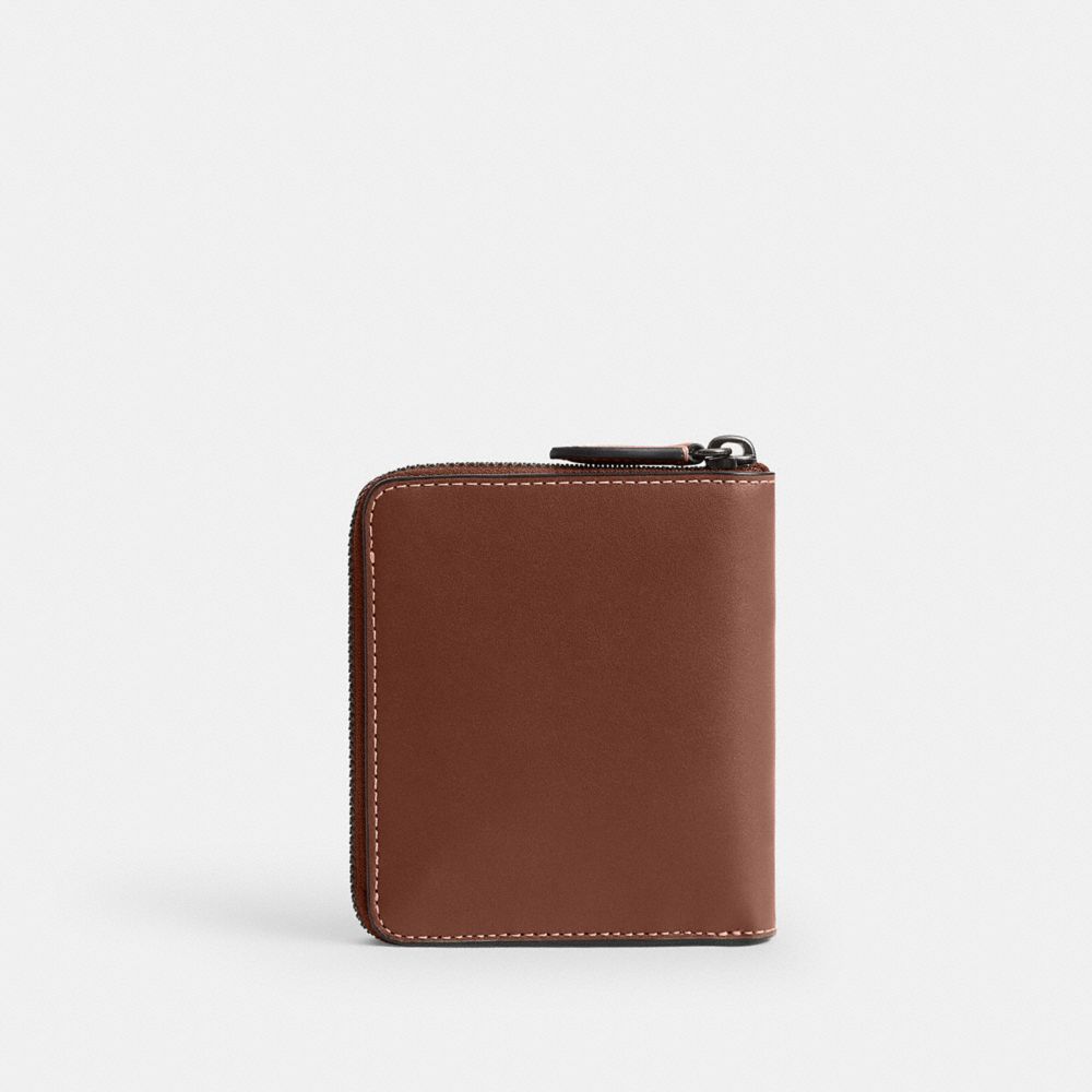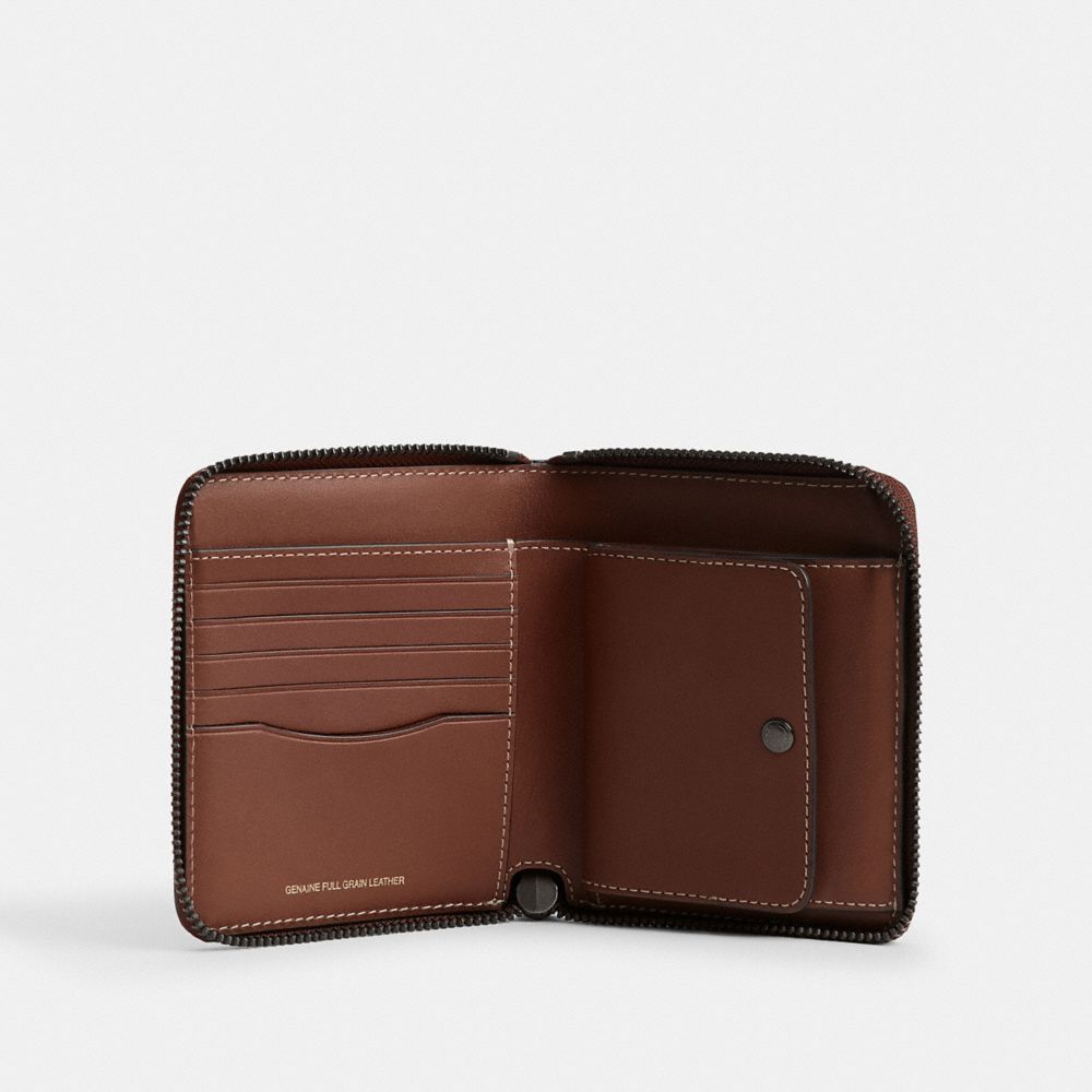 コンパクトなのに小銭を出し入れしやすい、手のひらサイズの薄い二つ折り財布。ナチュラル グレイン レザーで仕立てた、3辺に開くジップアラウンド開閉デザイン。