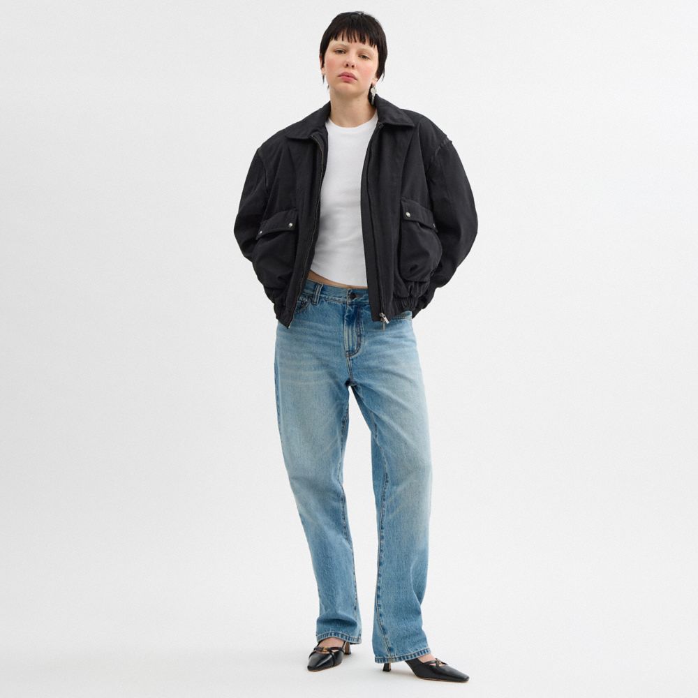 背中に刺繍されたコーチとマーティンキムのグラフィックが個性的なジャケット。マットなナイロンとコットン混紡でややクロップド丈に仕上げました。ウォッシュドトーン仕上げがヴィンテージ感を演出。立体的なフロントポケットと中綿が温かく保ちます。