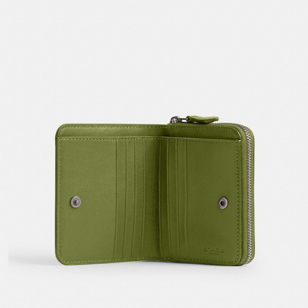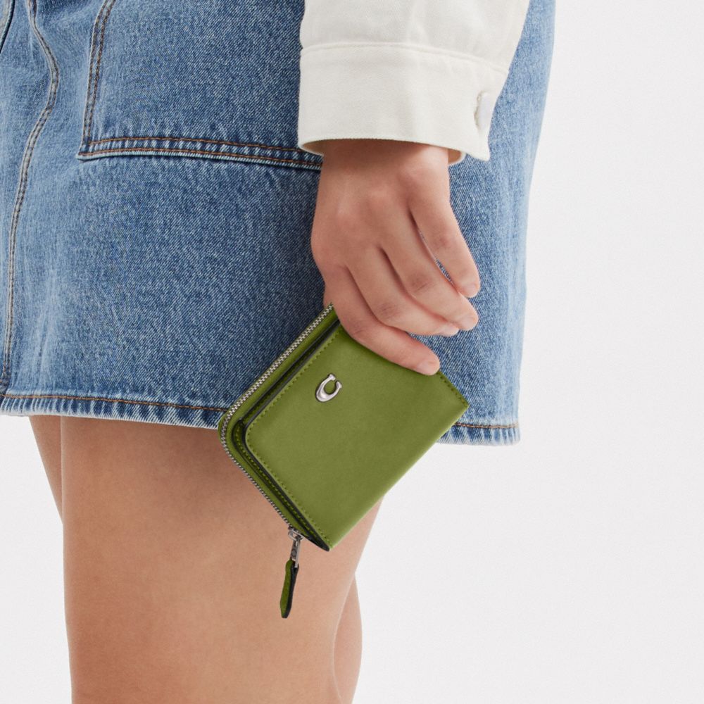 リファインド レザーにコーチの“C”のハードウェアをあしらった、二つ折りミニ財布。3辺に大きく開く小銭ポケットは、レシートやイヤフォンの収納にも便利な仕切り付き。スナップを外すと、8層のカードスロットと札入れが広がります。