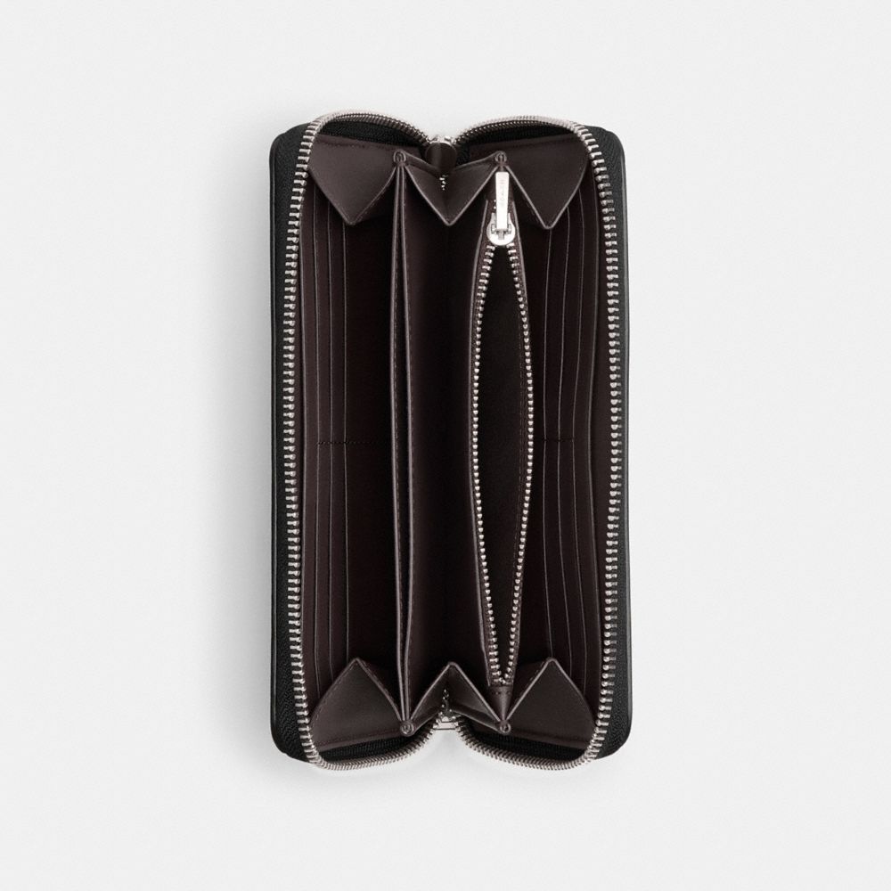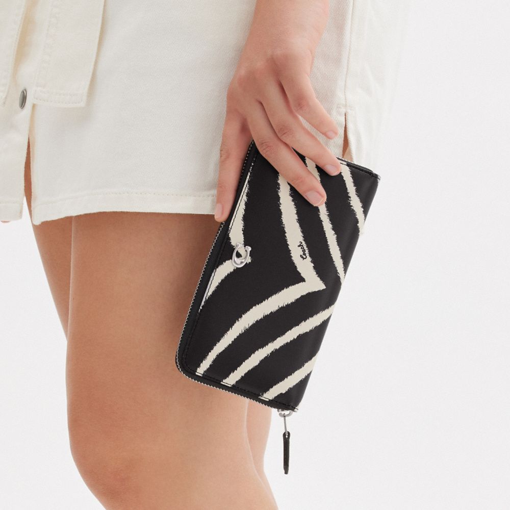 リファインド カーフ レザーに、ゼブラのグラフィックプリントが目を引く長財布。開くとゆとりあるインテリアが広がるジップ アラウンド開閉式。スマートフォンが入るスペース、12層のカードスロット、折らずに収納可能な2層の札室、ジップ付き小銭入れなどが付いており、必需品をすっきりと収納できます。