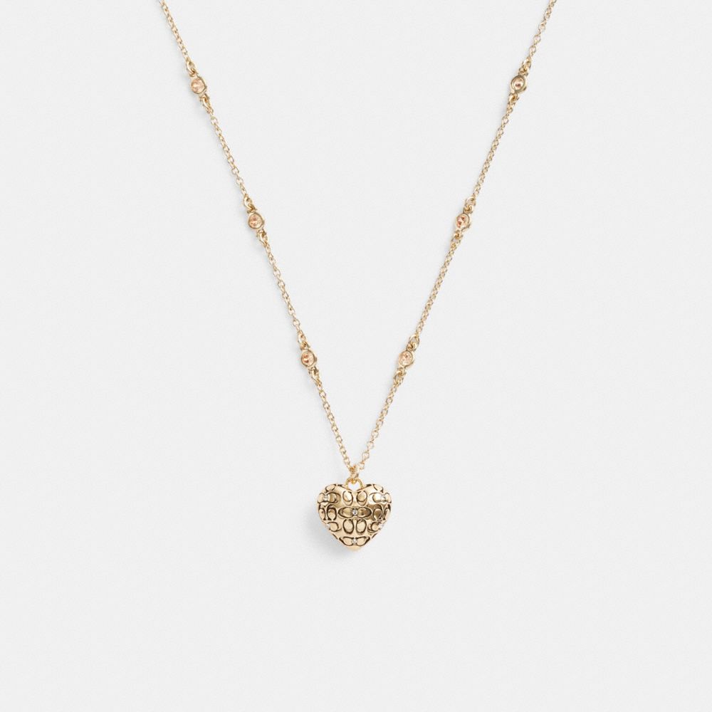 さりげなくクリスタルをあしらった、ハートのペンダント ネックレス。シグネチャー パターンをあしらったアイコニックなコーチ スタイルです。繊細なチェーンネックレスに、クリスタルがアクセントを添えます。アジャスタブル クラスプで、ロングにもショートにも長さを調節可能。お揃いのブレスレットやピアス、リングとのコーディネートもお楽しみいただけます。