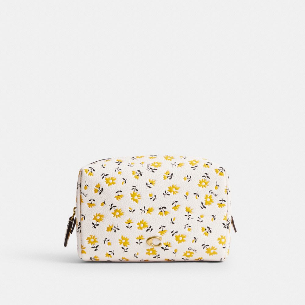 長めのジッパーが大きく開き、出し入れしやすいコスメティック ポーチ。ポリッシュド ペブル レザーで作り上げ、コーチの“C”のハードウェアをあしらいました。華やかに咲き誇る大ぶりのデイジーのモチーフが目を引きます。