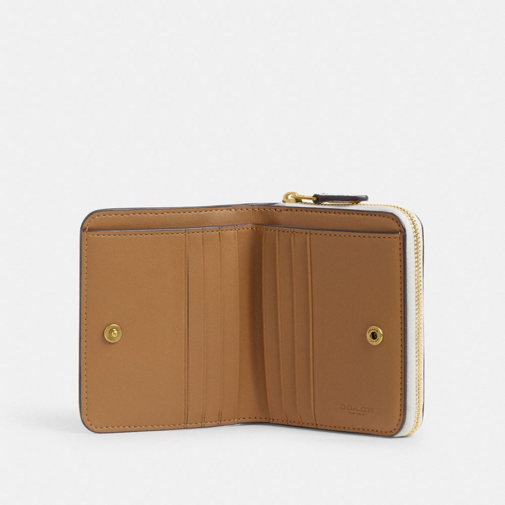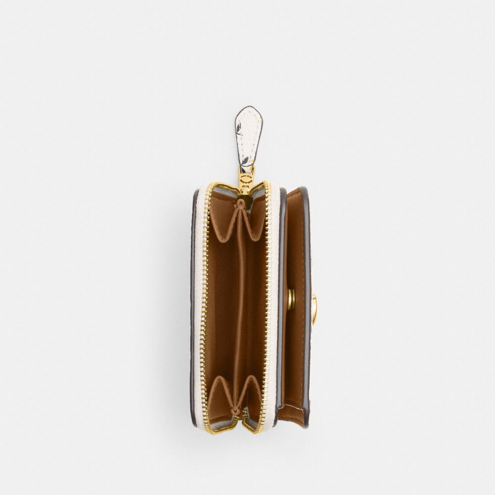 ポリッシュド ペブル レザーの二つ折りミニ財布。華やかに咲き誇るデイジーのモチーフが目を引きます。3辺に大きく開く小銭ポケットは、レシートやイヤフォンの収納にも便利な仕切り付き。スナップを外すと、8層のカードポケットと札入れが広がります。