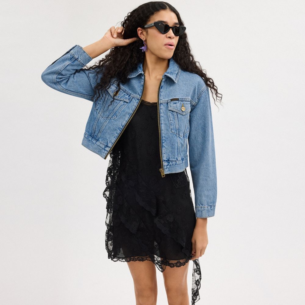 クラシックなトラッカースタイルをクロップド丈にアップデートした、ジップフロントのジャケット。環境に優しいコットンで仕立てた、ボクシーフィットのデニムジャケットです。胸ポケットにコーチのフラッグをあしらい、背面の裾にレザーパッチを添えました。