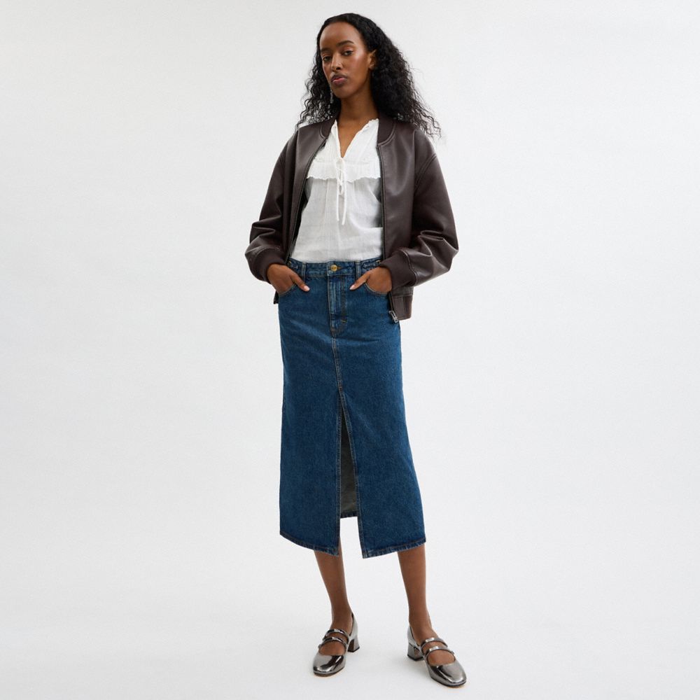 90年代のスタイルを思わせる、カジュアルクールなデニムのマキシ スカート。コーチの“C”のプラークが目を引きます。フロントベントの入った動きやすいスタイルです。お揃いのジャケットを合わせたコーディネート ルックを楽しんでみても。