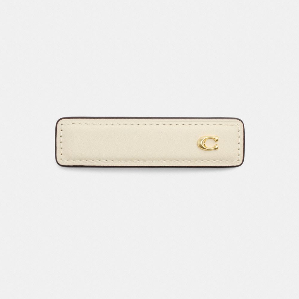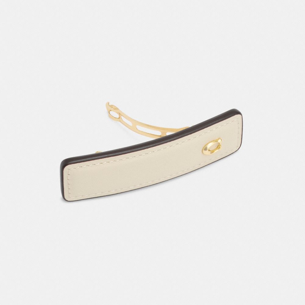 コーチのクラシックな雰囲気漂うスムース レザーのバレッタ。ポリッシュ仕上げのコーチの“C”をあしらった、優美なヘア アクセサリー。メッキを施した真鍮のクリック開閉式です。