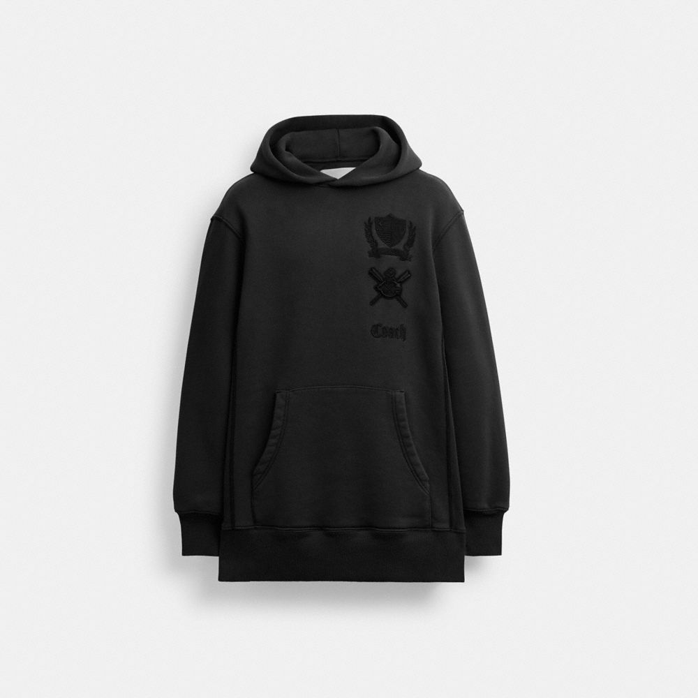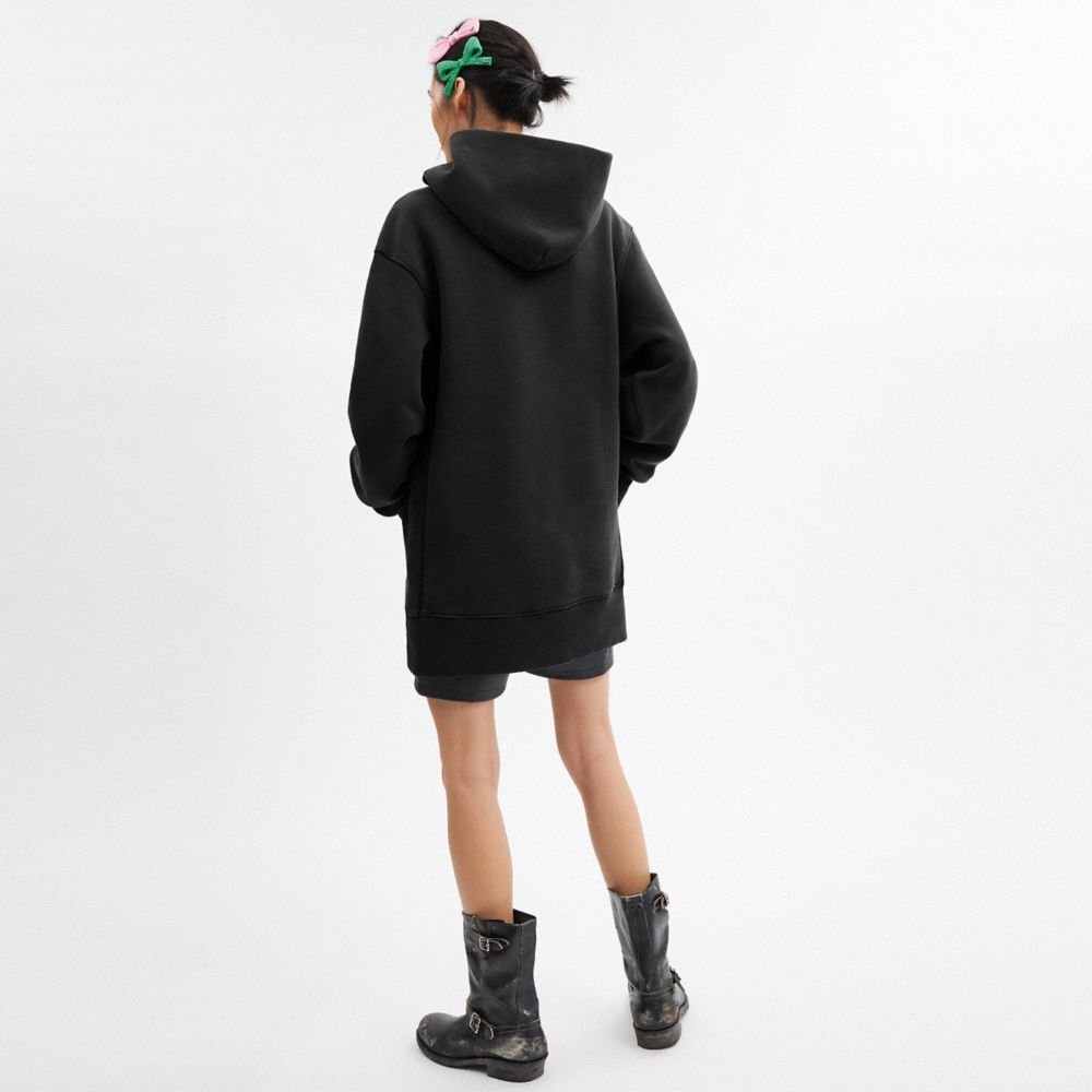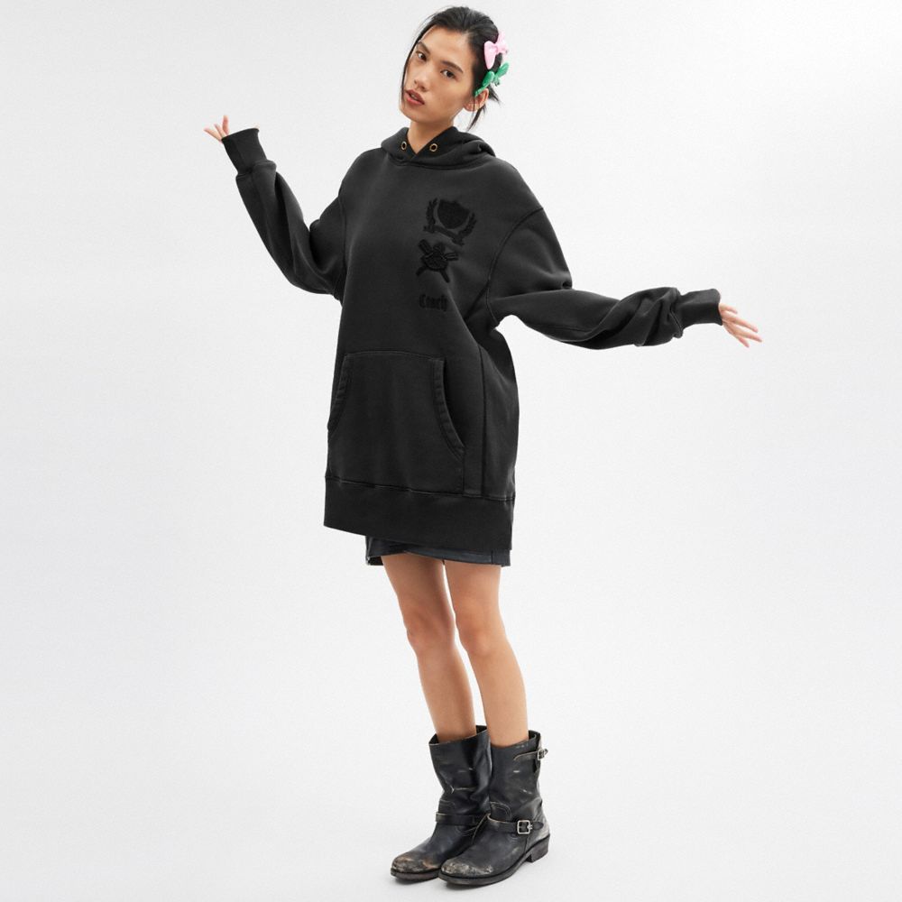 製品染めとウォッシュ加工で使い込まれたような柔らかい風合いに仕上げた、オーガニック コットン混のフーディードレス。紋章のようなコーチのクレストの刺繍がカレッジ風のクラシックな雰囲気を添えます。
