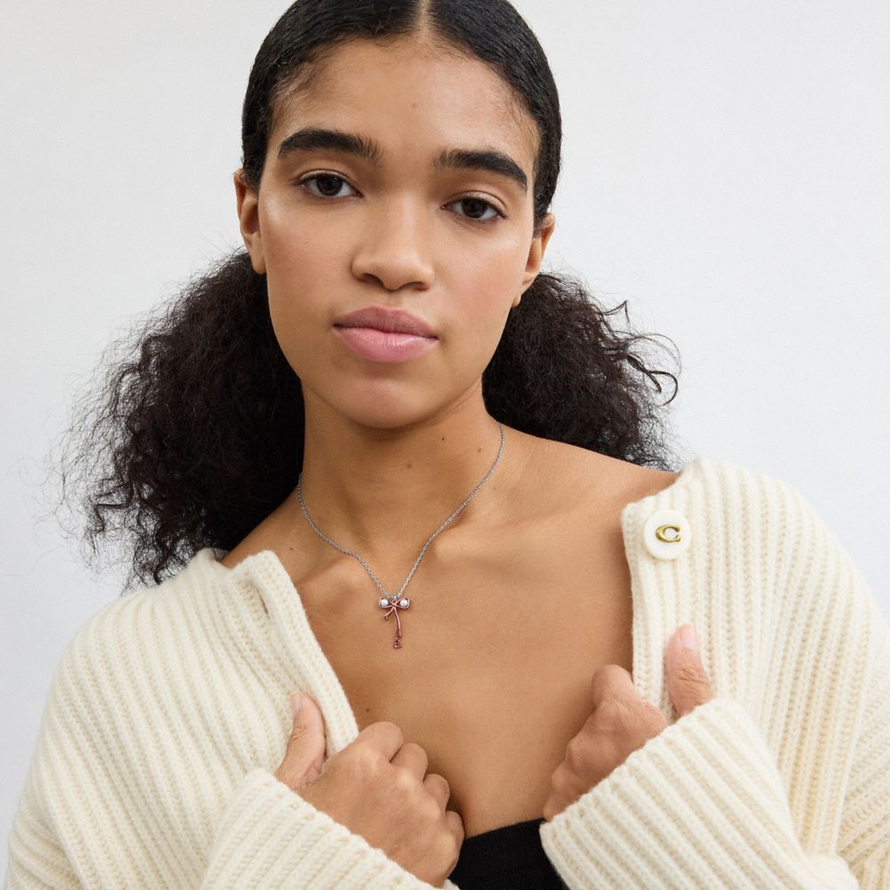 愛らしいリボンのペンダントに光沢のあるパールを添えた、繊細なネックレス。コーチの“C”がクラシックな雰囲気を添えます。つけ外しが簡単なクラスプ開閉式です。