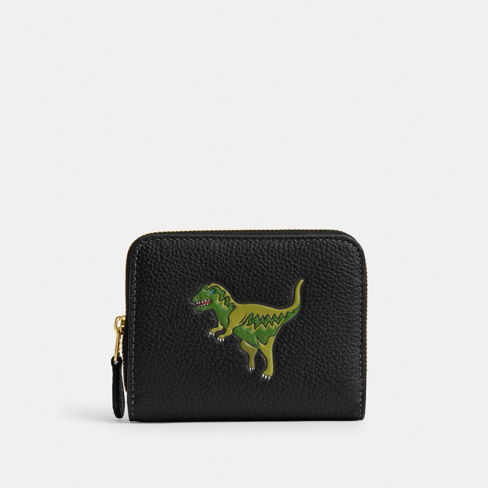 ポリッシュド ペブル レザーの二つ折りミニ財布。正面にあしらったコーチのアイコン キャラクターの恐竜<レキシー>が目を引きます。