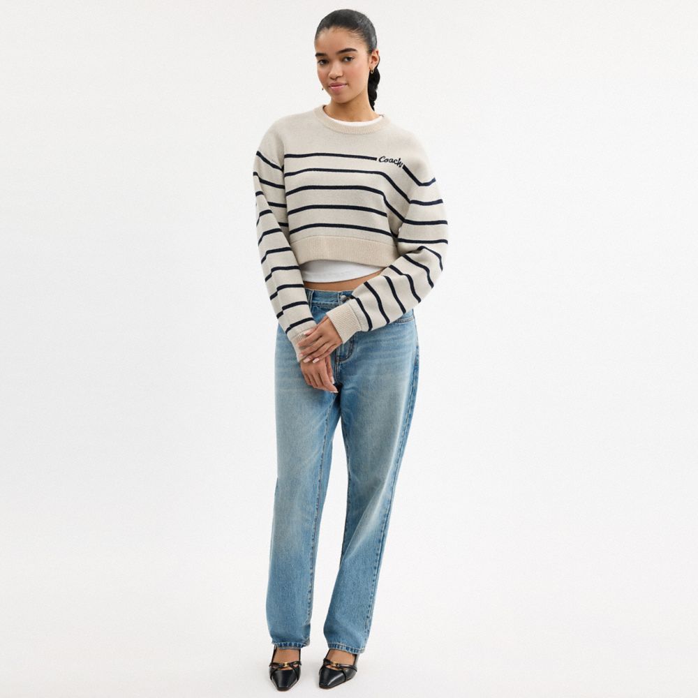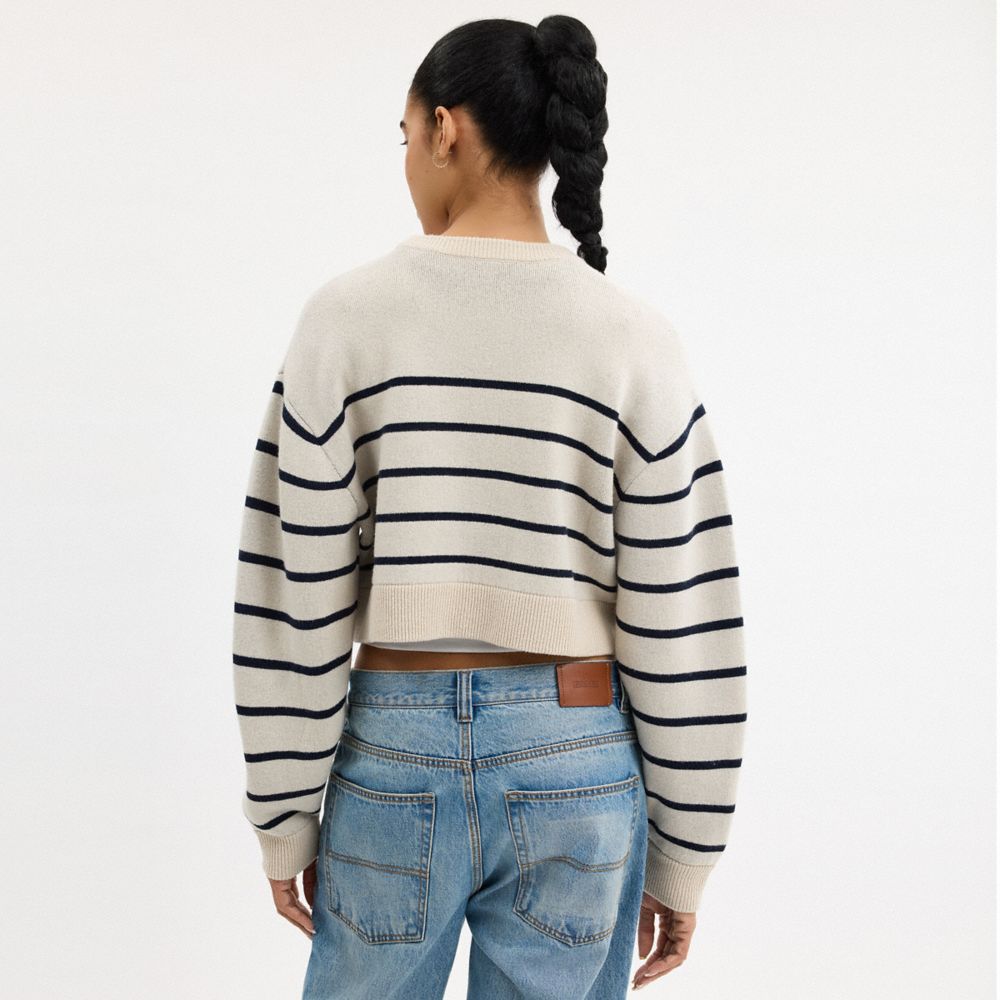 極柔のダブル フェイスのカシミヤ混ウールで編み上げたクロップド丈のセーター。心地よいリブ編みのトリムで仕上げた、ストライプが印象的なクルーネックです。胸元のコーチの筆記体のロゴがクラシックな雰囲気を添えます。