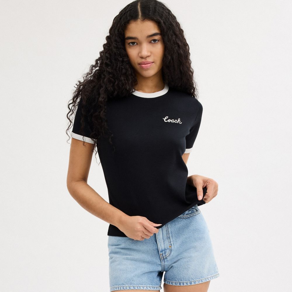 ワードローブの定番、クラシックフィットのコットンTシャツ。コーチの筆記体のロゴを刺繍であしらいました。コントラストカラーのトリミングで仕上げたクルーネックのスタイルです。