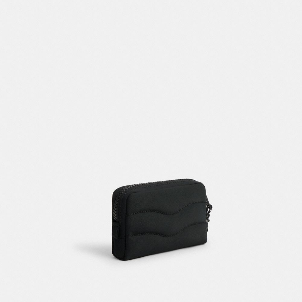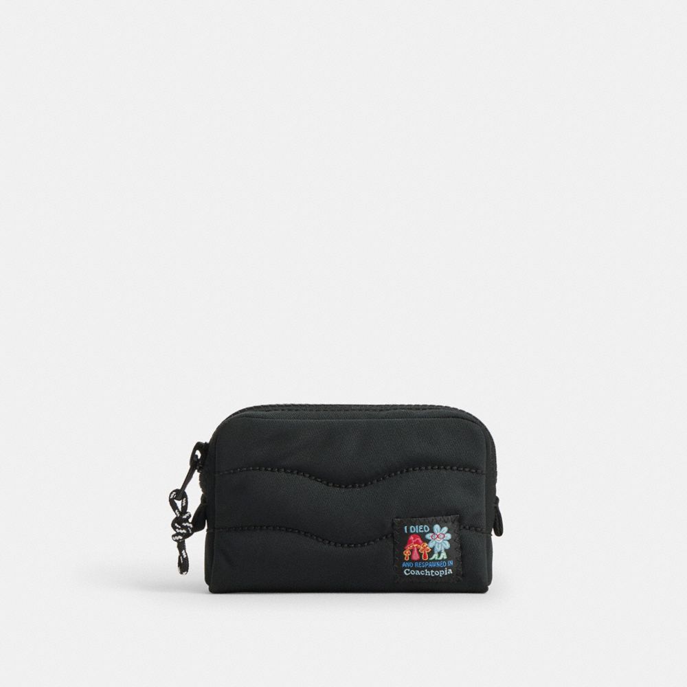 日本からのリクエストで実現した日本限定の軽量ポーチは、ふわふわが人気の定番シリーズのコンパクト版。カード、リップグロス、イヤフォンなど小さな必需品を収納するのにぴったりです。コード部分をのぞき100%リサイクルPETプラスチック(R-PET)製で、波打つような刺繍がアクセントに。ラウンドジップタイプで中身を出し入れしやすく、コーチトピアの楽しげなパッチが特徴的です。