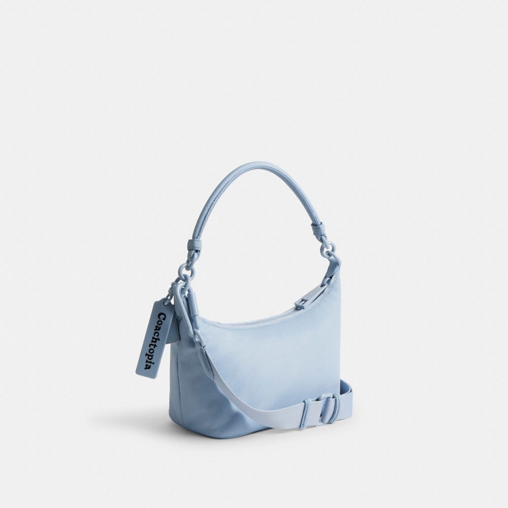 小脇にすっきり収まるコンパクトなショルダー バッグは、100%リサイクルPETプラスチック(R-PET)製。モノクロームを基調としたコーチトピアの楽しげなパッチを飾って仕上げました。