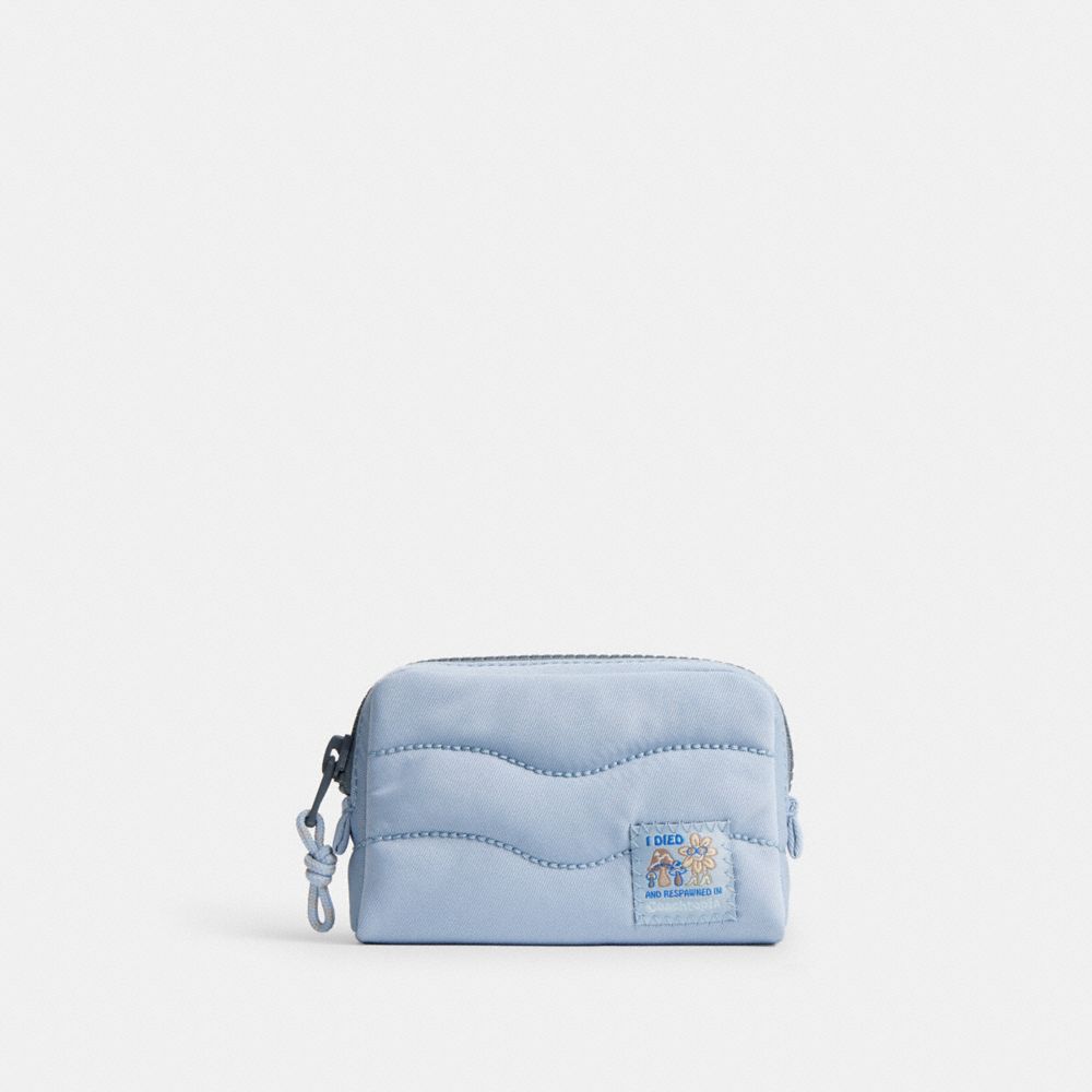 日本からのリクエストで実現した日本限定の軽量ポーチは、ふわふわが人気の定番シリーズのコンパクト版。カード、リップグロス、イヤフォンなど小さな必需品を収納するのにぴったりです。コード部分をのぞき100%リサイクルPETプラスチック(R-PET)製で、波打つような刺繍がアクセントに。ラウンドジップタイプで中身を出し入れしやすく、コーチトピアの楽しげなパッチが特徴的です。