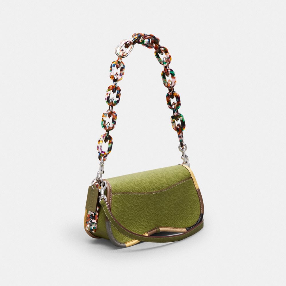 “今の直線的なファッションシステムを変えていく”というコーチのミッションが託されたショルダーバッグ、コーチトピア ウェイビー ディンキー。1973年に発表されたアーカイブバッグのシルエットに、波型のデザインを新たに加えてモダンに甦らせました。リサイクル素材を部分的に再生利用してつくり上げたレジン製の付属のェーンストラップを使えばショルダーバッグとして、長めのレザーストラップを使えばクロスボディとして2WAYでお楽しみいただけます。