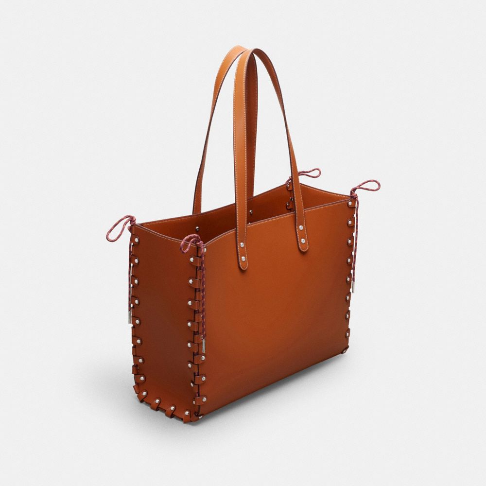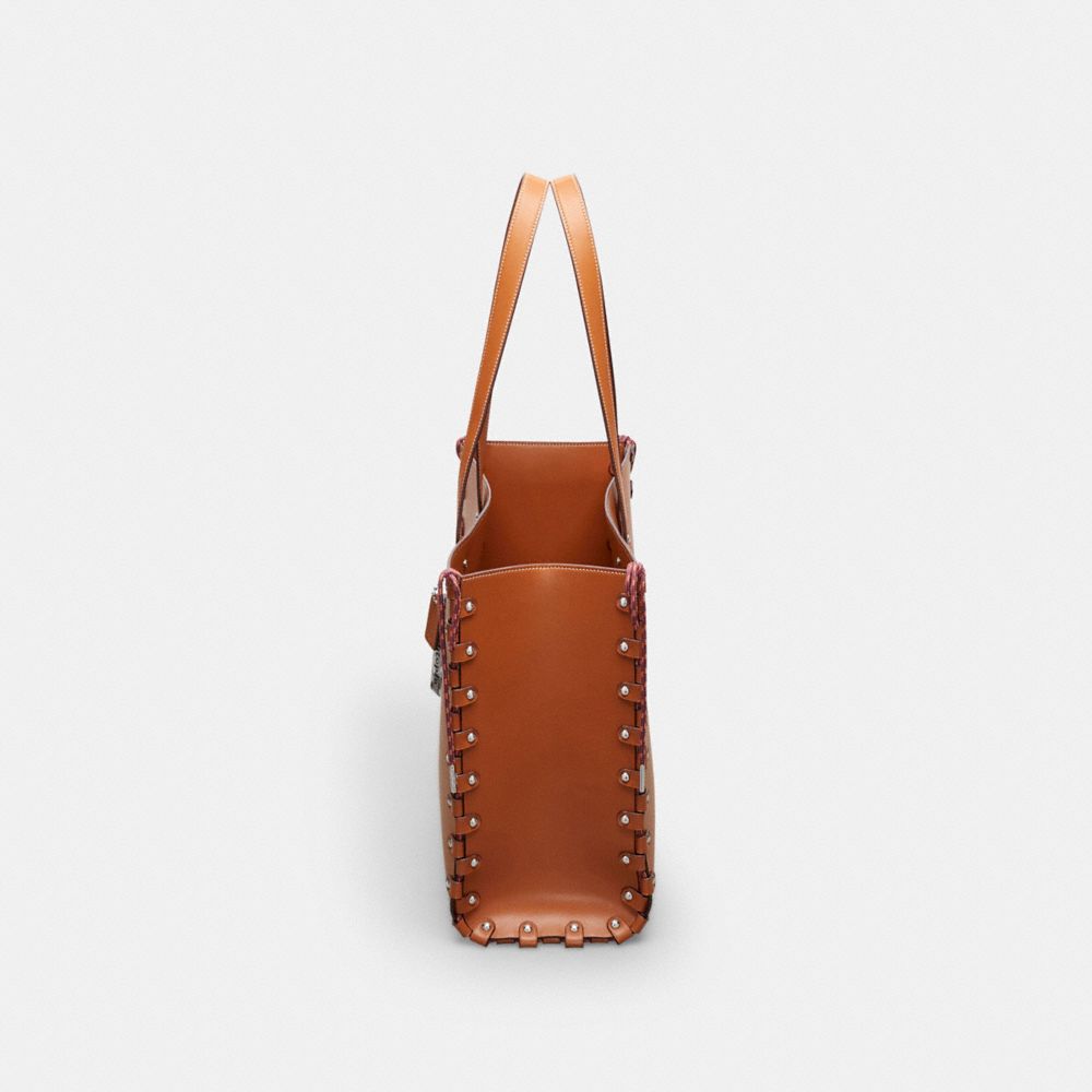 レースで結び合わされたシームと、交換可能なCoachtopiaレザーのパネルを備えたコーチトピア リレーサブル トート。手作業で分解し、再びレースを編みあげて組み立てることができるのが特徴的です。