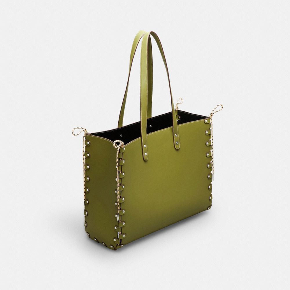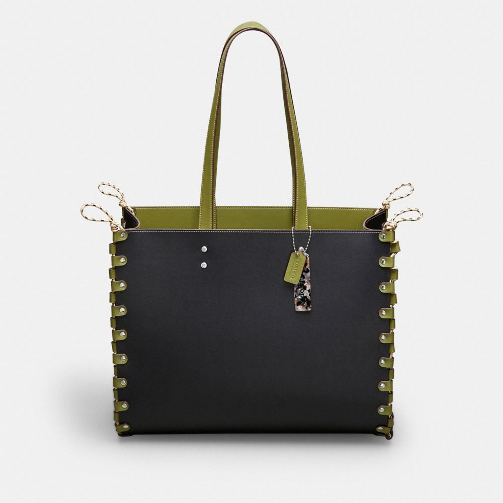 レースで結び合わされたシームと、交換可能なCoachtopiaレザーのパネルを備えたコーチトピア リレーサブル トート。手作業で分解し、再びレースを編みあげて組み立てることができるのが特徴的です。