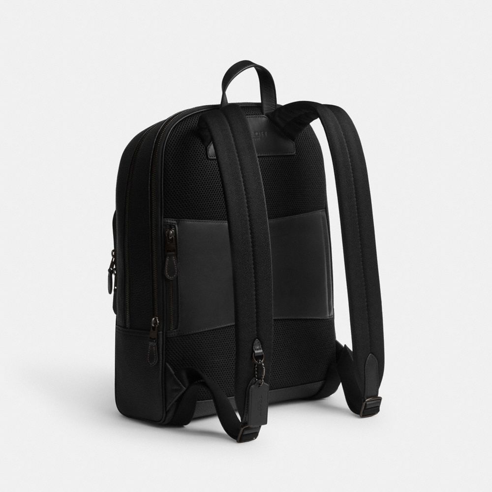 背面には通気性の高いメッシュ素材を採用。レザーショルダーストラップは調節可能です。ジップポケット付きのラゲッジスリーブも備えており、スーツケースなどの伸縮ハンドルを通せばキャリーオンバッグとしても使えるため、持ち運びに便利です。