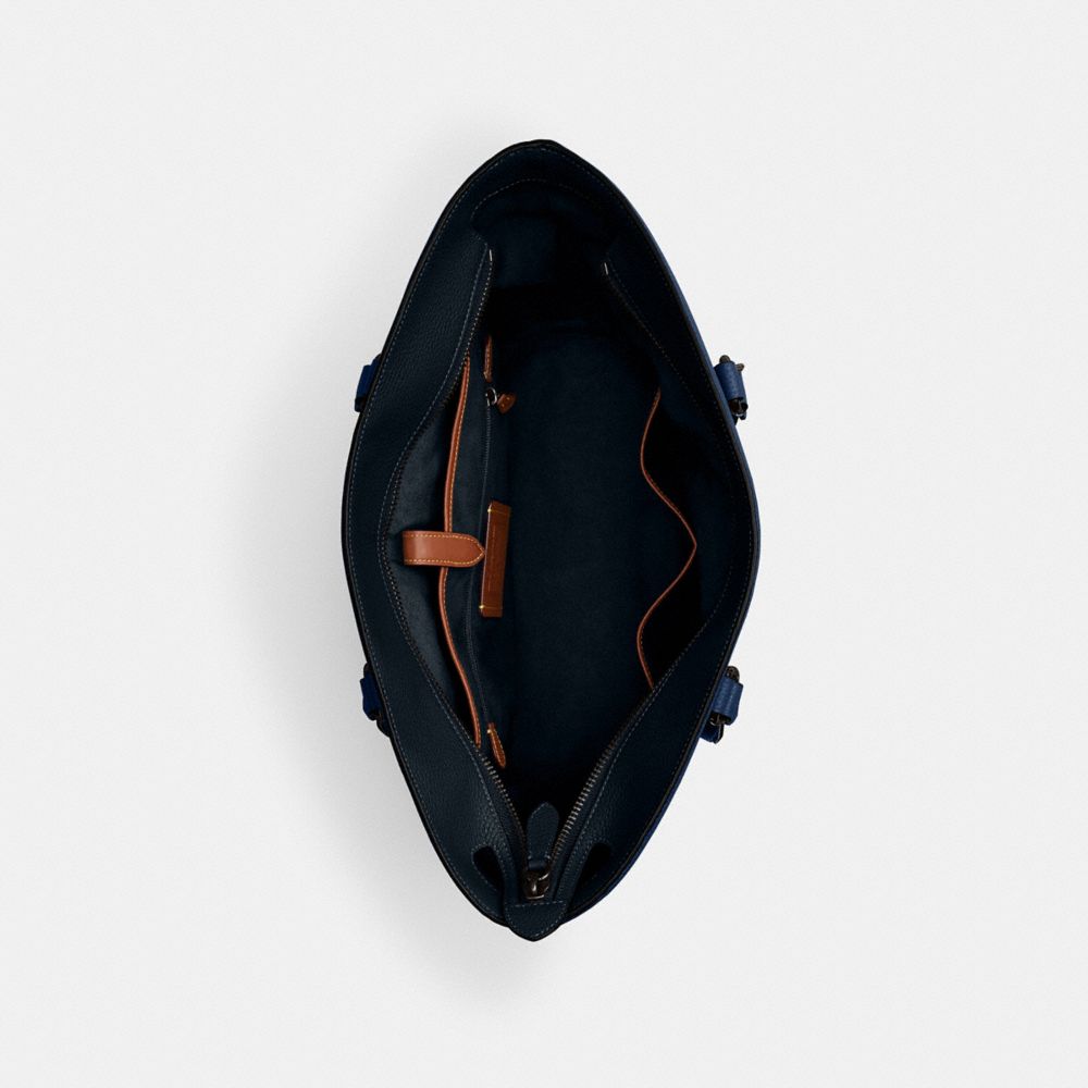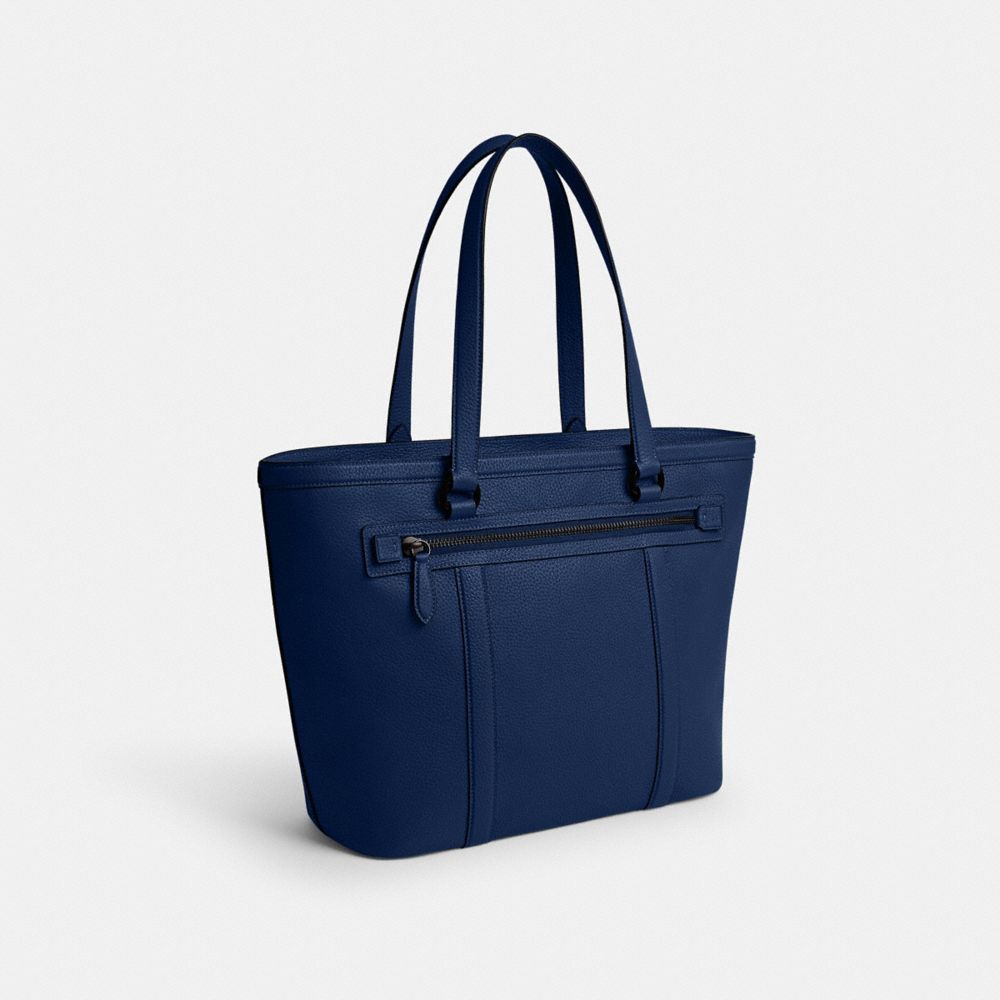 ぺブル レザーで仕立てた、セキュリティ面も安心のジップ トップ開閉。天蓋は少し中に入りこむ形にしているため、天蓋の上にはアウターを置いて持ってみても。両面レザーのハリ感により、少ない荷物でもバッグが自立するのも高ポイント。