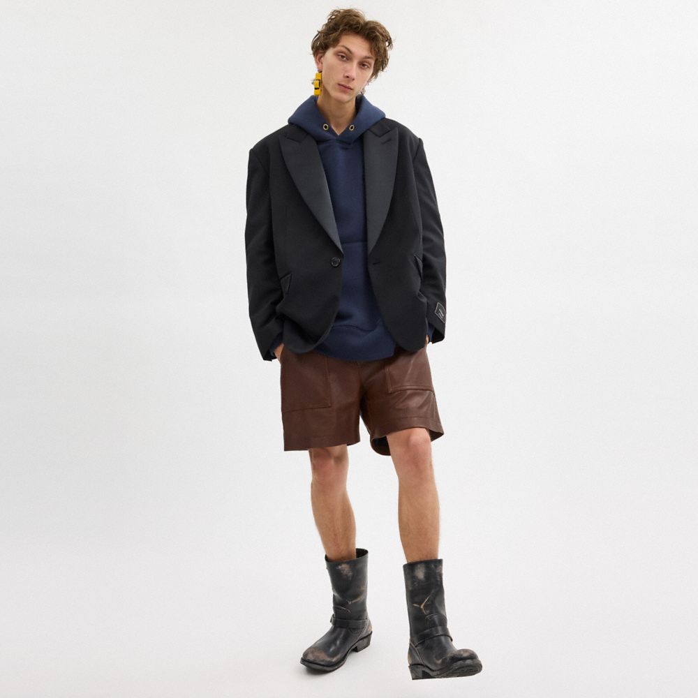 クラシックなヴィンテージスタイルをモダンにアレンジした、シングルブレストのタキシードジャケット。暖かいウールにサテンのピークラペルをあしらった、ゆったりとしたスタイルです。裏地にはシルクの風合いのあるコーチ ロゴのライニングを施しました。